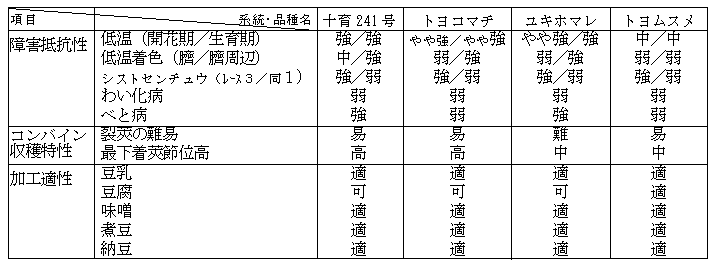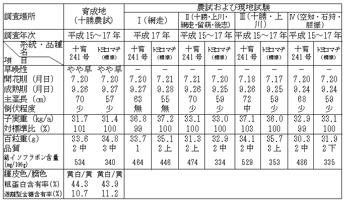 「十育241号」は、「トヨコマチ」並のやや早の熟期の白目中粒系統で、収量性も同品種並である。イソフラボン含量は、「トヨコマチ」の1.5倍程度で、北海道優良品種のなかで最も高含量の「音更大袖」並から高い。低温抵抗性は強で「トヨコマチ」のやや強より強く、低温による臍・臍周辺着色粒の発生が少ないため、収量、外観品質が安定している。最下着莢節位高は「トヨコマチ」並であるが、裂莢しやすいためコンバイン収穫適性は同品種よりやや劣る。粗蛋白含有率、粗脂肪含有率は「トヨコマチ」並で、全糖および遊離型全糖含有率は同品種よりやや低い。加工適性は、豆乳、味噌、煮豆、納豆については総じて適、豆腐は可との評価である。豆乳等飲料や味噌の加工業者からは、高イソフラボンを活かした商品の原料として、品種化を要望されている。