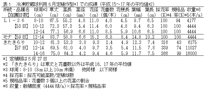 (1) 凍結貯蔵球利用5月定植作型での成績であり、長期抑制および促成作型は未検討である。