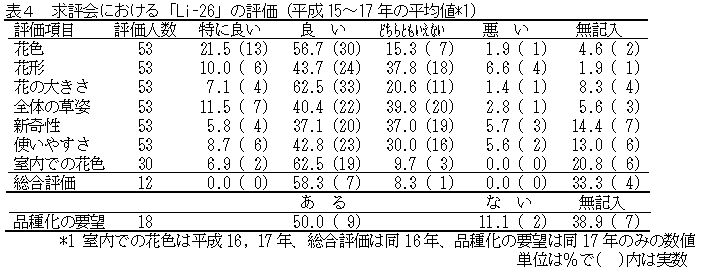 生産力検定試験圃場での求評会において、外部のゆり関係者ら(生産・市場・小売り・種苗 販売・農協・市町村農業センター等)にアンケートによる評価や意見を聴取したところ、花色 と小輪性についての評価が特に高く、室内における花色評価も良かった。総合評価としても半数以上の回答者から「良い」または品種化を要望する回答が得られ、生産を希望する参加者もいた。そのほか、汎用性が高い良い色で商材として使いやすいなど品種として普及を期待する意見もあげられ、実用品種として高い評価が得られた。
