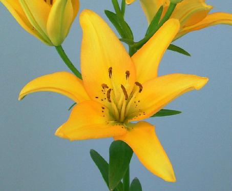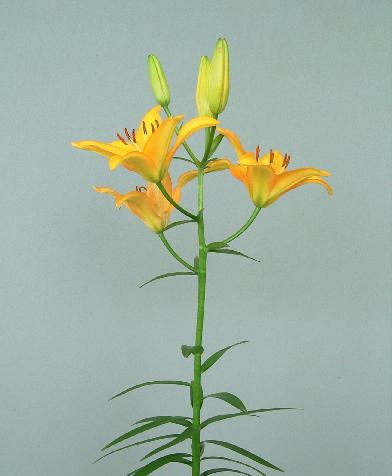 特徴:鮮やかな黄金色で斑点の少ない良花色小輪系統。小球根でも花蕾数が多く、一年球を切花生産に利用できる。