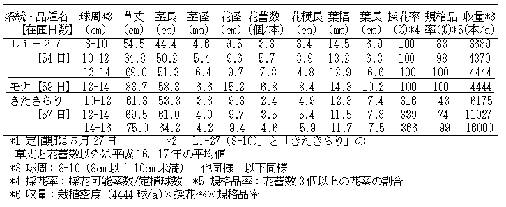①早晩性:冷凍貯蔵球を用いた5月定植栽培での採花までの日数(在圃日数)は約54日であり、「モナ」より5日、「きたきらり」より3日短い。