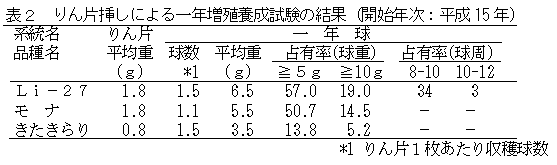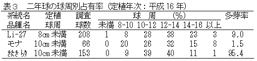 表1 冷凍貯蔵球利用5月定植作型*1での成績(平成15〜17年の平均値*2)