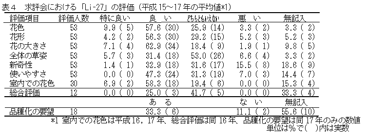 生産力検定試験圃場での求評会において、外部のゆり関係者ら(生産・市場・小売り・種苗 販売・農協・市町村農業センター等)にアンケートによる評価や意見を聴取したところ、花色 ・花形と小輪性についての評価が高く、室内における花色評価も良かった。また、花材として の利用性、小売・量販など販路の広さなども長所としてあげられ、生産を強く希望する参加者 もいたことなど、実用品種として高い評価が得られた。
