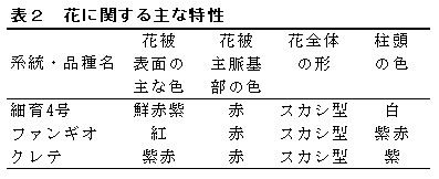 長所:花は鮮赤紫色、中輪でややカップ咲きの切花向きの系統で、少数の斑点を有するが目立たない。一年養成球における肥大性および花蕾数の揃いが良好で、一年養成球を切花