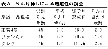 りん片挿しによる子球形成数は1りん片当たり2.0個で「ファンギオ」(1.6個)と同程度である。一年養成球の平均球重は24.5gで「ファンギオ」(23.0g)より重く、10gを超える割合は98.6%で