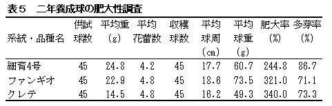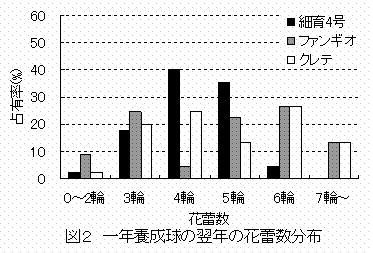 「ファンギオ」(79.1%)より高い。一年養成球の翌年摘蕾時の花蕾数は4.2個で、「ファンギオ」(4.8個) よりやや少ないが、4〜5輪の占める割合が75.6%で輪数の揃いが良く、一年養成球を