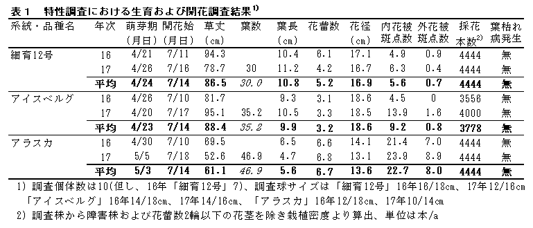 1)秋植え、無加温ビニールハウス栽培での成績であり、抑制栽培および促成栽培での調査は行っていない。