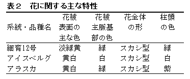 長 所:花色は開花初期には淡緑黄色でその後白色となる切花向きの系統である。花弁基部の色はやや緑色、斑点は極少数でほとんど目立たない。