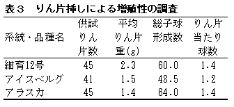 りん片挿しによる子球形成は、1りん片当たり1.4個で「アイスベルグ」(1.2個)と同程度である。一年養成球の平均球重は、30.8gで「アイスベルグ」(24.1g)より重く、球重が10gを超える割合