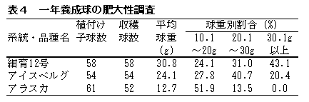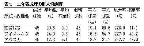 養成球を切花栽培に利用できる。二年養成球の平均球周および平均球重はそれぞれ19.1cm、69.6gで、「アイスベルグ」(16.5cm、54.7g)よりやや優る。