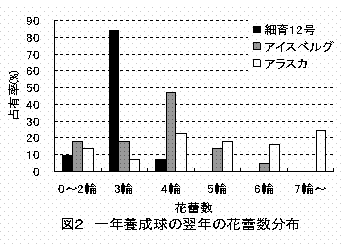は98.2%で「アイスベルグ」(88.9%)より高い。一年養成球の翌年摘蕾時の花蕾数は3.0個で「アイスベルグ」(3.6個)よりやや少ないが、3輪の占める割合が83.7%で輪数の揃いが良く、一年