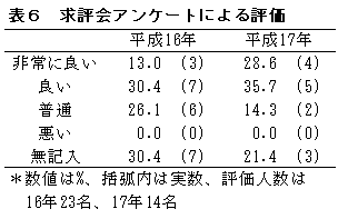 平成16年および17年の二ヵ年間、特性調査圃場において求評会を開催し、外部の参加者(生産者、流通・小売、種苗販売、地域農業センター、農協、ゆり育種家等)からのアンケートによる本系統に対する評価を得た。参加者からのコメントとして、「3輪ぐらいであれば草姿がコンパクトでよい」、「花壇向きにどうか。露地での適性を見たい」、「花のボリーム感がよい」、「低性、鉢物向きでは」などの意見があった。総合評価において「非常に良い」と「良い」を合計した割合は、平成16年は43.5%、平成17年は64.3 %であった。