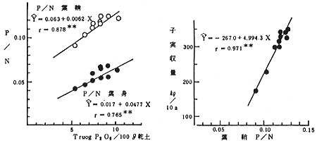 2)リン酸増肥は生育初期の茎葉のリン酸濃度を著しく高め、リン酸及び窒素の著しい吸収増大をおこし、生育初期の分けつ促進、1茎重、全乾重、葉面積の増加をもたらす。幼形期頃の茎葉リン酸濃度、葉鞘P/N比、リン酸吸収量及ぴ全乾重などは子実収量に関係が深く、これらの生理的要素は収量構成の形質に影響を及ぼす。