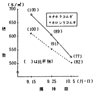 ①9月中旬の適播種期における播種量を標準播種量(340粒/㎡)より増すことは,越冬性の低下,倒伏の発生からみて好ましくなく,子実収量もやや減収する傾向を示した。むしろ,播種量を標準播種量より減じた方がよく,播準播種量の1/2の播種量でも標準播種量並の子実収量をあげることができた。また,ドリル播を想定した試験結果でも同様に播種量増による増収効果は認められなかった。(表-1,2)