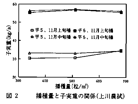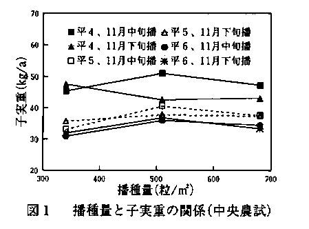 3)播種量について(図1、2)初冬播では、越冬後の個体数が150〜200個体/㎡程度確保できれば安定的な収量が得られ、播種量は越冬個体率を勘案しても、春播の標準量並からやや多めの340〜400粒/㎡程度で十分であった。