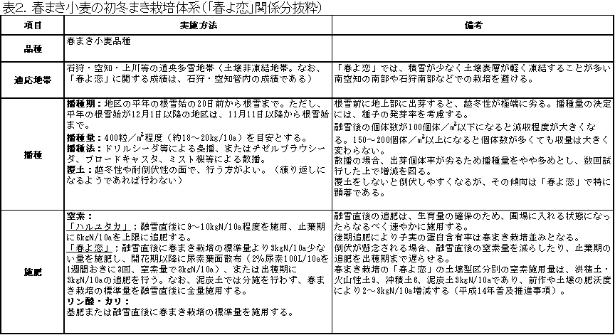 6)以上の成績を加味した「春まき小麦の初冬まき栽培体系」をまとめた。(抜粋を表2に示す)