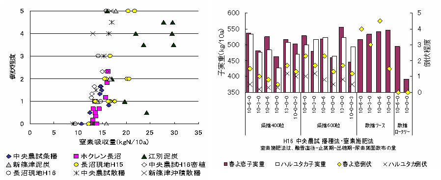 図1.窒素吸収量と倒伏程度の関係          図2.平成16年中央農試における子実重および倒伏