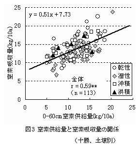 図3 窒素供給量と窒素吸収量の関係(十勝、土壌別)