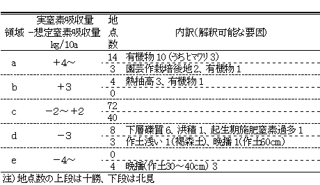 5)想定窒素吸収量と実窒素吸収量の差の程度をもとに、適合性を検証するとともに不適合要因を検討した結果、7割以上が±2kgN/10aの範囲におさまっていて、不適合地点としては多量に有機物を施用した圃場や起生期生育量の大きく劣る圃場などが認められた(表2)。