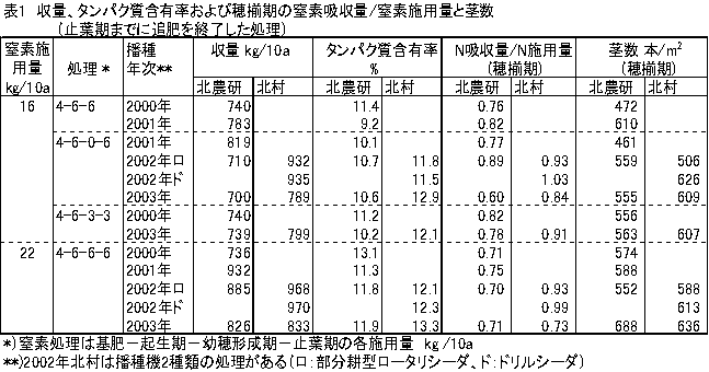 kg / 10aとし、追肥として起生期、幼穂形成期、止葉期、穂揃期における施用の有無、量を変えた。追肥には硫安を用いた。北農研圃場は淡色黒ボク土の転換畑で、直播水稲-春小麦の後である。現地圃場は高位泥炭土に客土をした転換畑で、北農研圃場より熱水抽出窒素が高かった。前作は大豆-小麦である。
