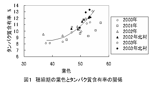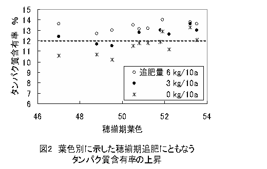 (3)穂揃期の追肥によってタンパク質含有率はすべての処理で上昇した。上昇程度は穂揃期の葉色が低いほど大きく、また、追肥量が3