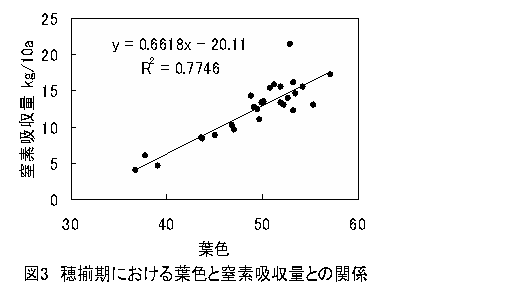 kg / 10aより6 kg / 10aで大きかった。葉色値が50未満では6kg / 10aの追肥で、また、葉色値50〜52では3
