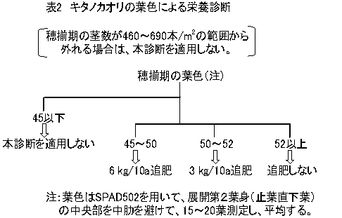 kg / 10a、葉色値が50未満の時は6 kg / 10aの穂揃期追肥を行う。本診断を適用する範囲として、穂揃期の茎数が460〜690本/m2(収穫期穂数440〜640本/m2)の範囲で、さらに穂揃期の葉色45以上の場合とする(表2)。