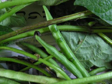 莢での病徴は水浸状の不正形病斑を示し(写真上),病斑部には菌泥を生じる。