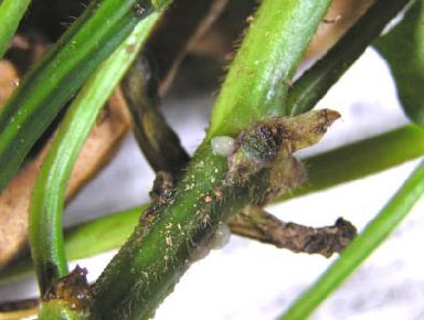 主茎でも水浸状の病斑を呈し,細菌の漏出が認められた(写真下)。