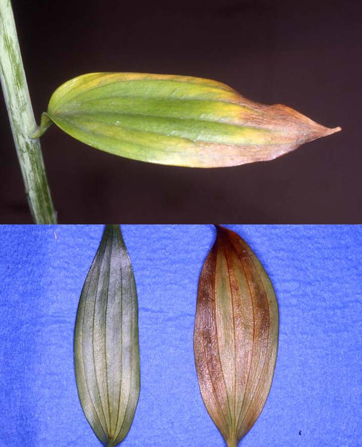 平成18年7月上旬、空知管内由仁町のオリエンタルユリ(品種「シベリア」)に、葉や花芽が奇形化して葉が黄化枯死する症状が発生した。被害株は下位葉から葉脈で仕切られる帯状に黄変し、葉の先端付近から褐変枯死した。このような症状の葉を切り刻んで1日間水に浸けたところ、体長約0.6~0.8mmのセンチュウが多数遊出した。分離したセンチュウは、北海道農業研究センター奈良部上席研究員により、イチゴセンチュウと同定された。