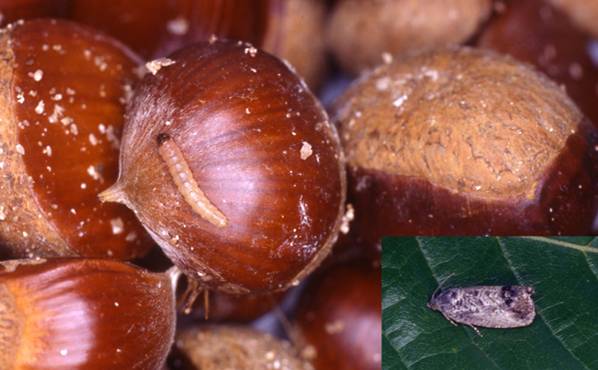 平成18年9月下旬に、札幌市南区の果樹園2園地において収穫期のくり殻果内部を鱗翅目幼虫が食害する被害が発生した。被害果は、果皮にあいた孔から白色顆粒状の糞が排出され、後に幼虫が脱出した。幼虫は体長約20mmで体色は黄色がかった乳白色、頭部・前胸背板は赤褐色を呈する。脱出幼虫は長楕円形で扁平、堅固な茶褐色の繭を形成し、内部で幼虫(前蛹)態で越冬した。翌年夏季に羽化した成虫は体長1cm弱で、翅は白色と黒色の斑模様で翅端付近に暗色部と黒色の小斑を伴い、クリミガCydia kurokoi (Amsel)と同定された。
