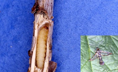 平成17年5月下旬に、後志支庁管内余市町の果樹園で栽培されているカーランツ、平成19年5月下旬には、空知支庁管内長沼町の果樹園2園地のレッド、ブラックカーランツに、枝の髄部を穿孔加害する害虫による被害が発生した。被害部は径3~6mm程度の枝が主体で、被害枝は枝上の芽が全て枯死するか、新芽の発芽・生育が極めて劣った。被害枝は、髄部が加害により空洞化し、内面は暗褐色を呈した。茎内部には、体長11mm内外の鱗翅目の老令幼虫および蛹が認められた。6月中旬~下旬には、成虫が羽化した。羽化成虫は、スグリコスカシバ(新称)Synanthedon tipuliformis (Clerck)と同定された。
