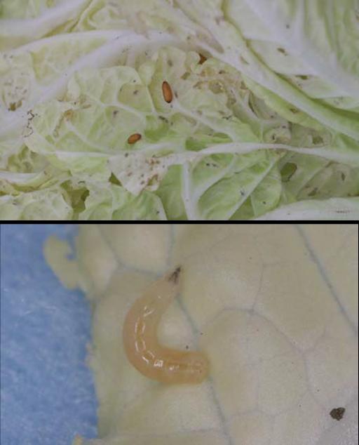 平成19年7月下旬、十勝支庁管内清水町で収穫されたはくさいの結球内部に食葉被害が発生した。被害株の結球上位部には、タネバエDelia platura (Meigen)の幼虫および蛹が1~5頭程度認められ、外葉から心葉に向かって食害しながら侵入していた。8月上旬に現地の2ほ場(約1haおよび2ha)を調査した結果、収穫株の寄生率は70%~90%に達していた。このような被害株に対する食害は外から20葉程度内部まで達していたため、生食向けの商品として出荷できるものは全くなく、残りのわずかな心葉部分を加工用とせざるを得なかった。加害は7月下旬収穫の作期以降、8月中旬収穫の作期まで続き、この期間の減収被害は甚大であった。 本種は通常、地表に産卵し、作物の地下部を食害する土壌害虫であり、地上部を加害することは少ない。特に生育後期の作物において、地表から離れた茎葉の上位部を加害するのは稀な事例であると考えられる。なお、平成18年には十勝支庁管内鹿追町でも8月中旬収穫の作期で同様な食害が発生していた。また、空知支庁管内長沼町の中央農試ほ場においても、平成16年7月下旬に収穫したはくさいで結球部内の葉に食害を確認している。