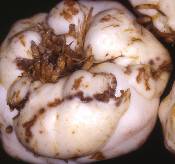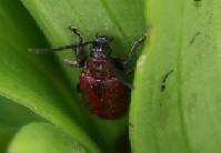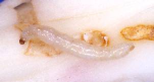 平成18年12月、真狩村において、貯蔵している食用ユリの鱗片に潜って食害した痕跡が確認された。症状は鱗茎表面の表皮下を幅2㎜程度の溝が走り、表皮が破れて褐変していた。被害球率は1%程度であったが、潜行内部の褐変症状により被害球は出荷が困難であった。被害球の一部で鱗茎中心部まで症状が見られ、この中から白色で体長約10㎜、腹脚を欠き胸脚を持つ幼虫が採集された。この幼虫から、加害種はSangariola punctatostriata (Motschulsky)と同定された(松沢春雄氏同定)。本種の成虫は体長5~7㎜、体背面は赤褐色、体腹面、触角及び脚は黒色で、北海道では5~9月にかけて観察される。幼虫はユリ科植物の鱗茎に潜るとされている。寄主植物はカタクリ、オニユリ、ヤマユリなどのユリ類である。