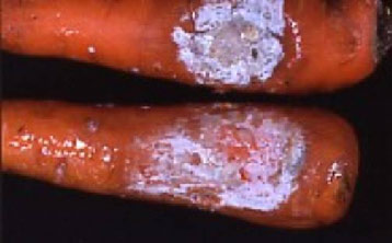平成14年9月,北海道富良野市で貯蔵中のニンジン根部が白色の病斑に覆われる症状が発生した.罹病部は水浸状に軟化腐敗し,深く陥没する症状も見られた(上図)。病斑部から白色の菌そうで気中菌糸のない糸状菌が分離された。分離菌をニンジン根部に接種したところ,同様の症状が再現された。病原菌の菌糸幅は6.9-13.7μmで,菌糸の先端は二股状に分岐する。