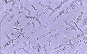 分岐後,一方の菌糸は先端から分節して円筒状の分生子となり,その大きさは4.2-6.7×6.1-12.3μmである(下図)。炭素源の同化性やその他病原菌の諸性質から,本病菌はGeotrichum candidum Link と同定された。