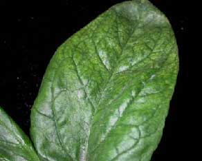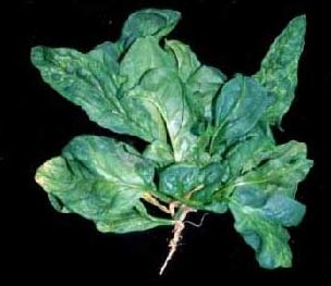 平成14年11月中旬および15年9月上旬に旭川市のホウレンソウ(品種「パルク」,「サンパワー」)で発生した。健全株に比較して株が小さく,新葉は濃淡の斑紋となってモザイク症状を呈する(写真上)。