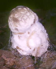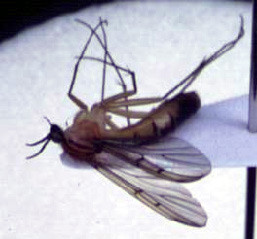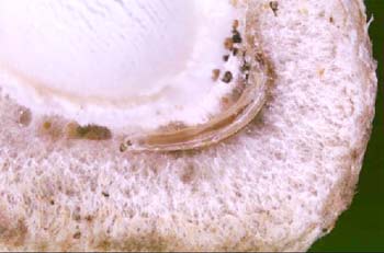 ビニルハウス内の菌床栽培しいたけに発生した。加害幼虫は、体長が約15mmと大型で、体色は透明な乳白色、光沢のある褐色の頭殻を持っており、子実体(しいたけ)や菌床の表面を食害した。幼虫はその場で蛹化し、体長6mmのナガマドキノコバエ(Neoempheria ferruginea Brunetti)成虫が羽化した。成虫は胸部背面に5本の黒い縦筋があるのが特徴である。本種は全国に分布し、本州では、散水方式の菌床栽培で被害が目立っているが、生態は不明である。直接的な防除方法はないため、栽培施設への侵入防止や菌床残渣の適切な処分が重要である。
