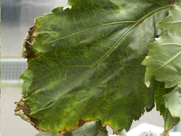 発病個体の導管部は褐変し、褐変部位からは高頻度で糸状菌が分離された。分離菌は、PDA培地上ではじめ白い綿毛状の菌叢を拡げ、やがて中心部から黒変しビロード状を呈した。分生子柄には無色で3〜5本のフィアロイドが輪生し、その先端に2.0〜3.0μm×3.8〜5.0μmの分生子が形成された。後に培地上に粒子状の微小菌核を形成し、生育適温は20℃前後で、30℃でも生育したことから、本菌をVerticillium dahliae Klebahnと同定した。