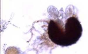 北海道で古くから発生している病害であるが,本病菌の子のう殻が確認できず,病原菌の同定がなされていなかった。平成15年に本病の子のう殻の形成株を認めたため,同定を行った。本病は葉に白色で粉状の病斑を形成する症状であるが,これら病斑を放置しておくと,白色病斑の中にまれに黒色の小粒点(閉子のう殻)が生ずる(下図)。閉子のう殻は群生または単生し,黒色球形ないし偏球形で,大きさは82.6〜131μmであった(次ページの図)。子のう殻内には子のうを4〜6個生じ,有柄で卵形〜楕円形,子のう胞子は子のう内に4〜5個生じ,楕円形〜卵形で黄色である。また,分生子柄は単生し,単鎖の分生子を生じた。分生子懸濁液をデルフィニウム(品種「フルカフリーデン」)に接種し,白色で粉状の病斑形成も再現された。以上のことから,うどんこ病の病原菌をErysiphe aquilegiae de Candolle var. ranumculi (Greville)Zheng&Chenと同定した。