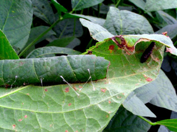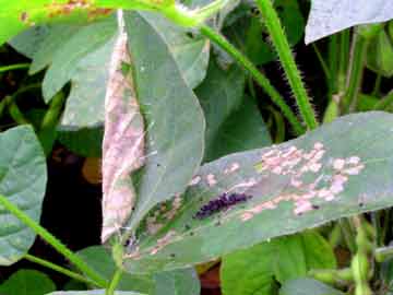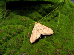 平成17年9月上旬、大野町の大豆ほ場で、葉を巻いてその中に潜み加害している幼虫を発見した。老熟幼虫の一部は既に1〜数枚の葉を縦長の円筒状に巻き込み、糸で綴り合わせ、中で蛹化していた。開長30mm前後で、全体に淡黄色ないし淡灰褐色の成虫が羽化し、ウコンノメイガPleuroptya ruralis (Scopoli)と確認された。本種は日本全土に発生し、北陸地方では中齢幼虫のイラクサ科野草での越冬が確認されている。日本海側の地域で多発する傾向があり、大発生が突発的であることから、成虫群の飛来が発生の原因とも推察されている。なお、富山県においては、本種による捲葉が最も多くなる8月下旬の1個体あたり平均捲葉数が20を超えると子実が小粒化して減収するとされている。