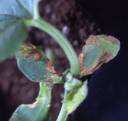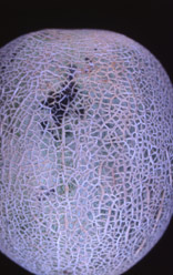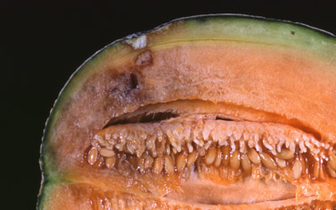 平成17年6月、上川管内の富良野市、上富良野町、中富良野町で葉や果実が褐色〜黒褐色に腐敗する症状が発生した。子葉および本葉では葉縁から暗緑色で水浸状の病斑が形成され,後に褐色病斑となった。つるにもはじめ水浸状でのちに褐色となる不整形病斑が現れた。果実では黒褐色で水浸状の病斑が表面に認められ、内部は淡褐色に変色し、種子に達していた。病原細菌は接種試験、寄主範囲、細菌学的性質、PCR法による診断などからAcidovorax avenae subsp.citrulliで、本邦未発生の病害であることから、病名をメロン果実汚斑細菌病(新称)と提案した。本病原細菌の詳細については平成17年度病害虫発生予察情報特殊報第1号を参照のこと。