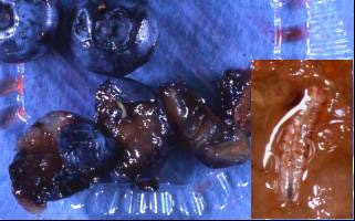 平成17年9月、富良野市で果実内部がウジ状幼虫に食害を受けた。羽化成虫によりオウトウショウジョウバエ Drosophila suzukii (Matsumura)と同定された(中央農試 岩崎)。本種は、成虫は体長約3mm弱、暗黄褐色。雄は後方に向かって多少とも暗色となり、翅頂近くに小黒紋を有す。雌の尾端にある産卵器の下縁には、鋸歯状突起が並ぶ。卵は乳白色、長径0.5mm内外で2本の糸状突起(矢印)を伴う。幼虫は体長6mmに達し白色のウジ状。オウトウでは、産卵は果実の着色が始まってからで、熟果に多く、肥大中の幼果には認められない。キイチゴ、モモ、サクラ、ブドウ等の熟果に寄生することも知られている。本種に対する登録農薬は合成ピレスロイド系の一剤に限られる。被害軽減のために、適期収穫を行い、発生源になる取り残された果実や被害果などは放置しない。