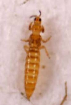 平成14年7月に砂川市のハウス栽培のひまわり(品種:「輝」)で,下位葉より葉が黄化する被害が発生した。まだ黄化していない葉では多数の白色の小斑点ができ,葉裏にはアザミウマの成虫・幼虫が寄生していたことから,この被害は,アザミウマの加害によるものと考えられた。このアザミウマは,クロゲハナアザミウマThrips nigropilosus(Uzel)と同定された(上川農試,中尾弘志)。発生地では,ハダニによる葉の被害状況と似ていたことから,殺ダニ剤のみの防除を行なっており,そのため被害が大きくなったと思われる。本種は,キク科,キンポウゲ科に寄生し,短翅型の成虫が見られることが知られている(梅谷ら,1988,「農作物のアザミウマ」)。