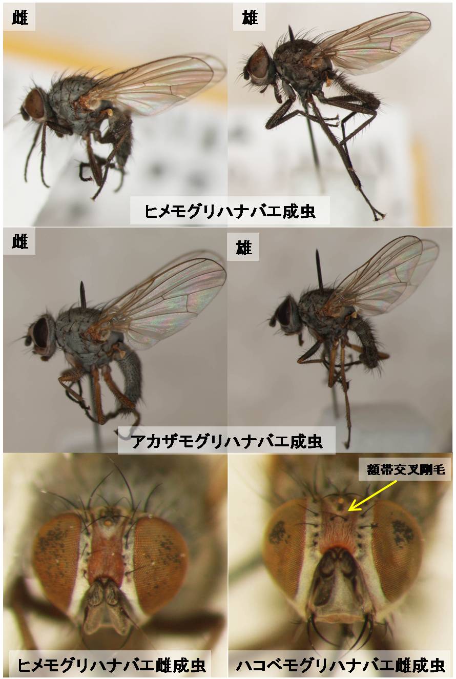 ほうれんそうに同様の症状を生じさせる害虫の内、アカザモグリハナバエ、テンサイモグリハナバエは、脚の一部または全体が黄褐色(ヒメモグリハナバエは黒色)で、囲蛹尾端に顕著な肉状突起をもたない(ヒメモグリハナバエは肉状突起をもつ)。本種同様黒色の脚をもつハコベハナバエは雌成虫の頭部に額帯交叉剛毛をもち(ヒメモグリハナバエは額帯交叉剛毛をもたない)、いずれも本種との識別が可能である。本種の寄主植物はこれまでハコベ類のみが知られており、ほうれんそうに加害した事例はこれが初めてである。