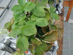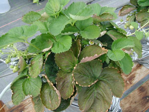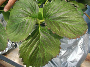写真19 古葉の縁枯れに伴って、内側への巻き込みも生じる。 (13週目 -Mg8週目 エッチエス-138)