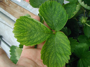 2)葉緑体のリンタンパク質と結合しているため、欠乏するとクロロシスが現れる。鉄は体内移行性が低いため、その欠乏症状は新葉に現れるのが一般的である。