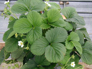 2)新葉の生長がやや抑制されて小葉化の傾向も見られるが、株全体と根は健全であり、花房の伸長と果実の着果も確認される。