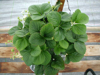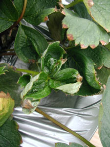 写真27 新葉の先端部の葉先枯れが進行し、株全体に葉身の上向きカップ状症状が見られる。  |