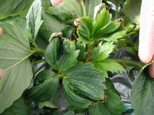 1)カルシウム欠乏と類似した症状、すなわち新葉の展開前からの奇形・葉身先端部の枯れ「チップバーン」が現れる(写真30)。